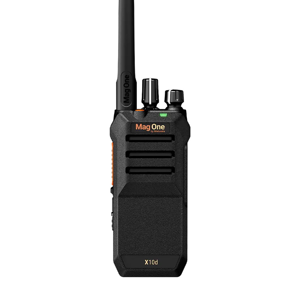 El Mag One X10d de Motorola Solutions es un radio portátil diseñado para pequeñas y medianas operaciones que necesitan comunicación fiable y sencilla en modo analógico y digital (DMR). Ofrece cuerpo compacto, gran potencia de audio (hasta 3 W de salida máxima) y autonomía prolongada —Motorola declara hasta ~23 horas de tiempo de conversación en condiciones típicas— además de carga por USB-C para mayor conveniencia. El X10d está disponible en VHF y UHF, soporta características prácticas como botón de emergencia, cancelación de ruido para mejorar la inteligibilidad en entornos ruidosos y clasificación IP55 para protección contra polvo y chorros de agua, lo que lo hace apto para hostelería, retail, logística y tareas de seguridad ligera.